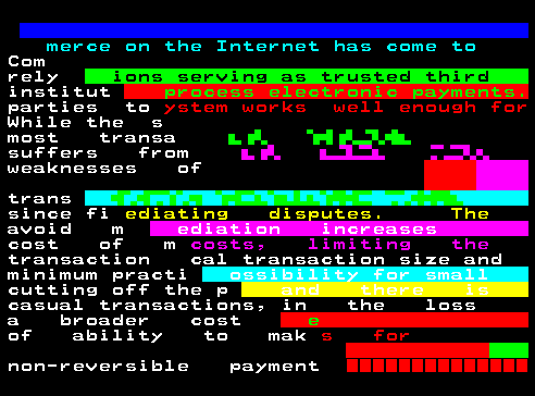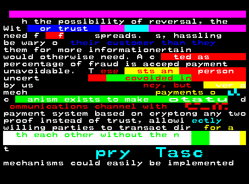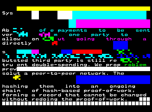 The medium is the massage. Fully on-chain teletext art broadcasted on teletext across about:blank#blockedEurope and stored forever on Tezos and Arweave. Included in the permanent collection of Museum Franciscum Carolinum and Museum of Teletext Art.