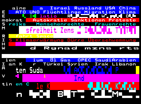 The contributed works stand out for their deliberate use of medium and context. Teletext raises expectations: on the one hand, it raises aesthetic expectations of technically possible colors and resolutions. Some works play with this ironically by producing even lower levels of detail, sometimes at great expense. On the other hand, the teletext medium raises service expectations of information, news and entertainment. But instead of neutral information, a clear position is taken here; against nation-state wars, against the abortion policy of the USA, against the lies of the classical financial system. Instead of repeating the daily news, it specifically highlights the blind spots, such as mechanisms of monetary policy, which are usually hardly discussed on TV. And instead of illustrating sex hotlines, one prefers to offer entertainment in the form of eerie short stories.